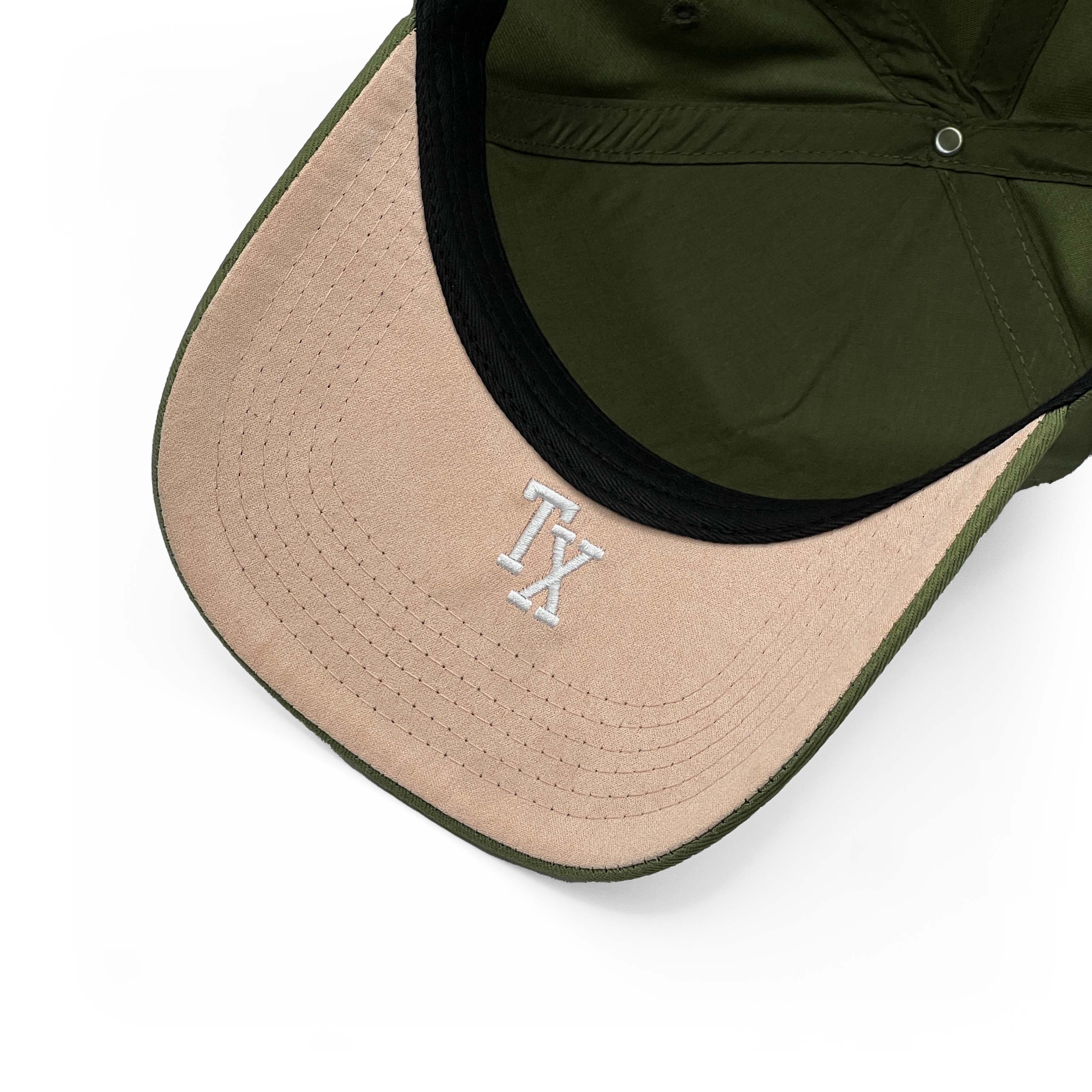 Fully adjustable 5-panel snapback with 3D embroidered "DALLAS" and flat embroidered State of Texas silhouette, & Prestige Collection™ logos. Features white logos on an olive green hat, a high-profile frame, & a pre-curved brim. Handmade from premium 100% cotton with rose pink suede under brim for exceptional quality.
